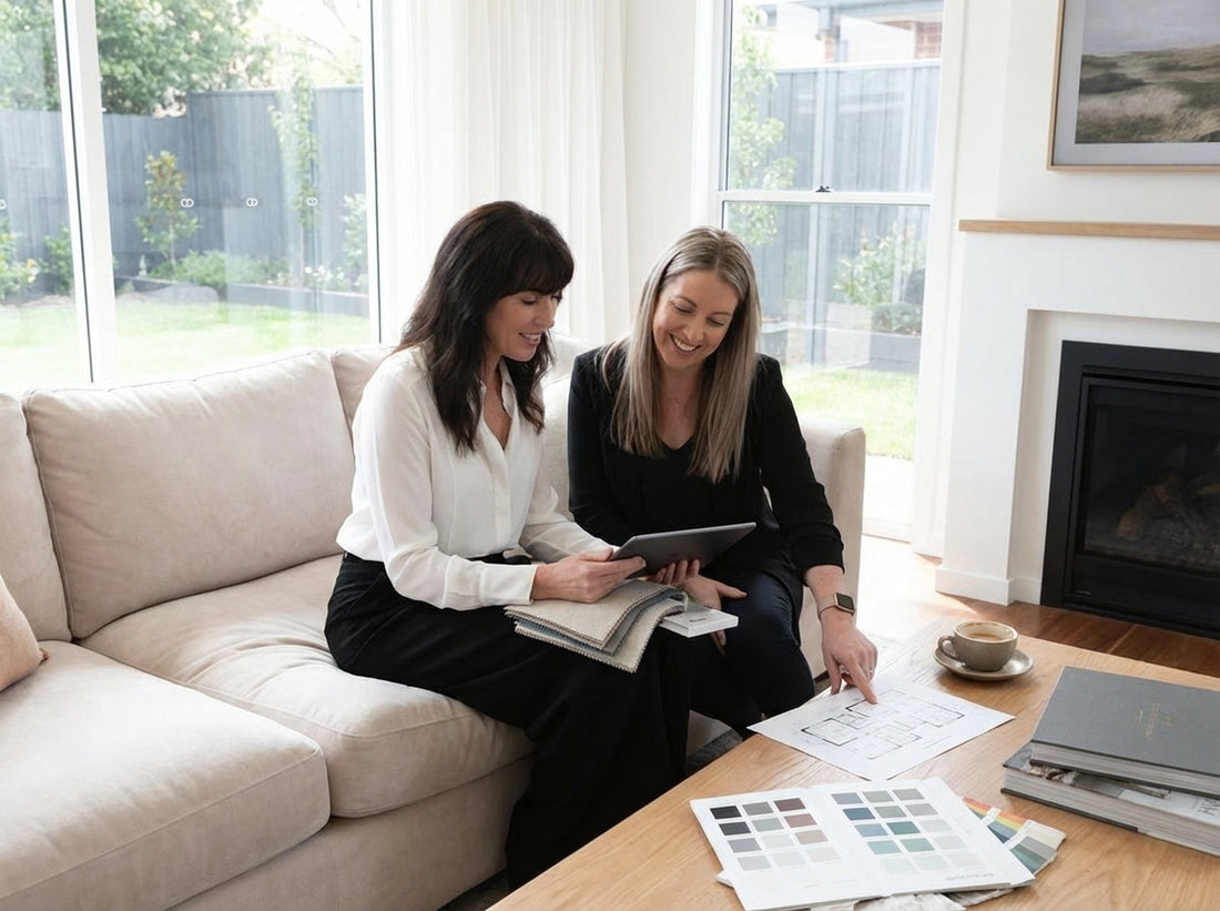 We are a full-service interior design studio based in Mount Eliza on the Mornington Peninsula, working from a single piece through to complete renovations and new builds. We collaborate closely with you to understand how you live, then specify every layer, from layouts and joinery to stone, flooring, fixtures, lighting, furniture and the final styling.