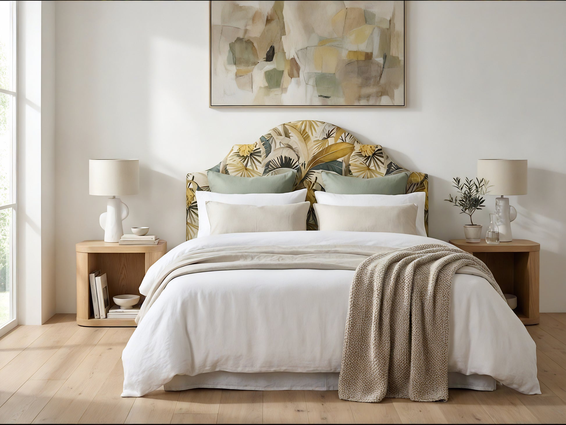 The Iona Bedhead is a softly sculptural statement, designed to bring character and calm into the bedroom without overpowering the space. Its gently curved silhouette and tailored upholstery give it a refined presence that feels both timeless and relaxed.
