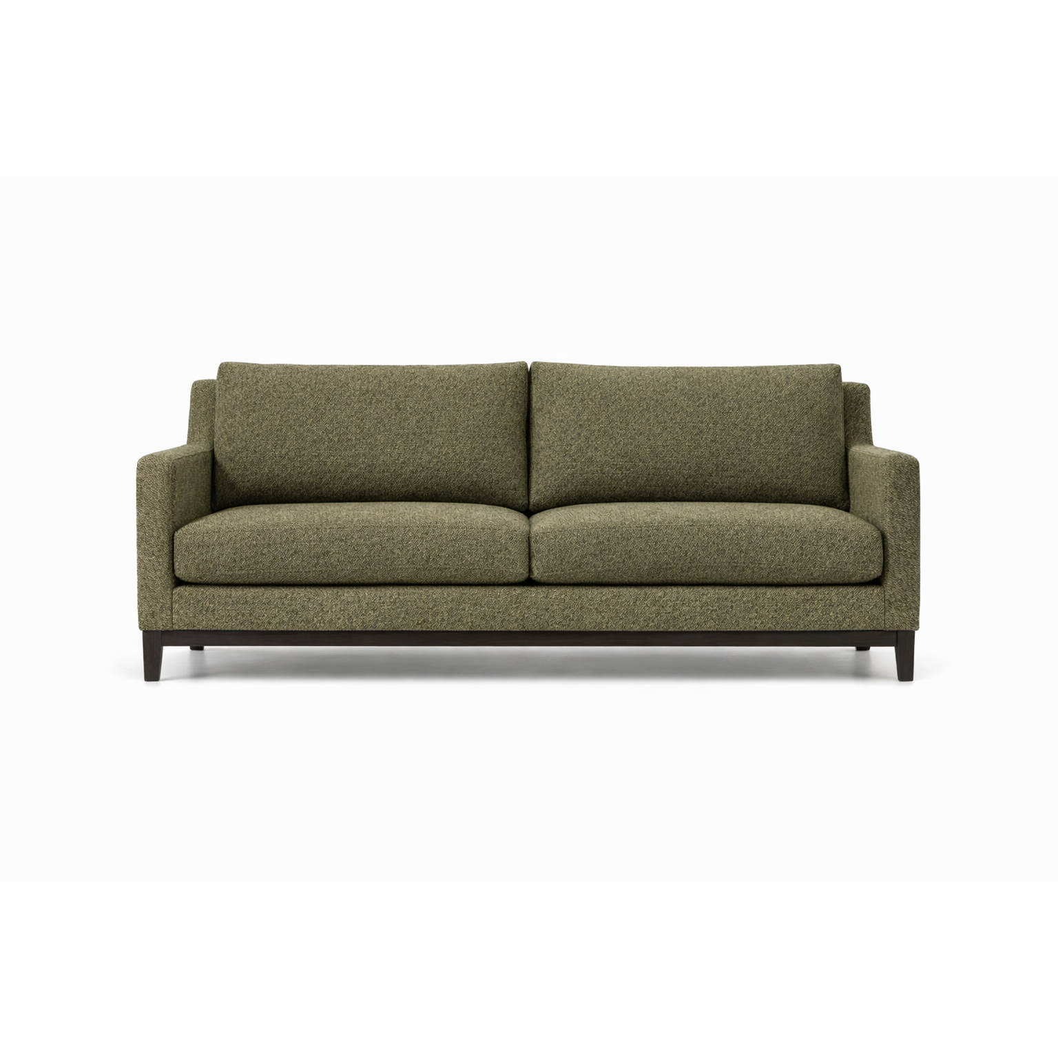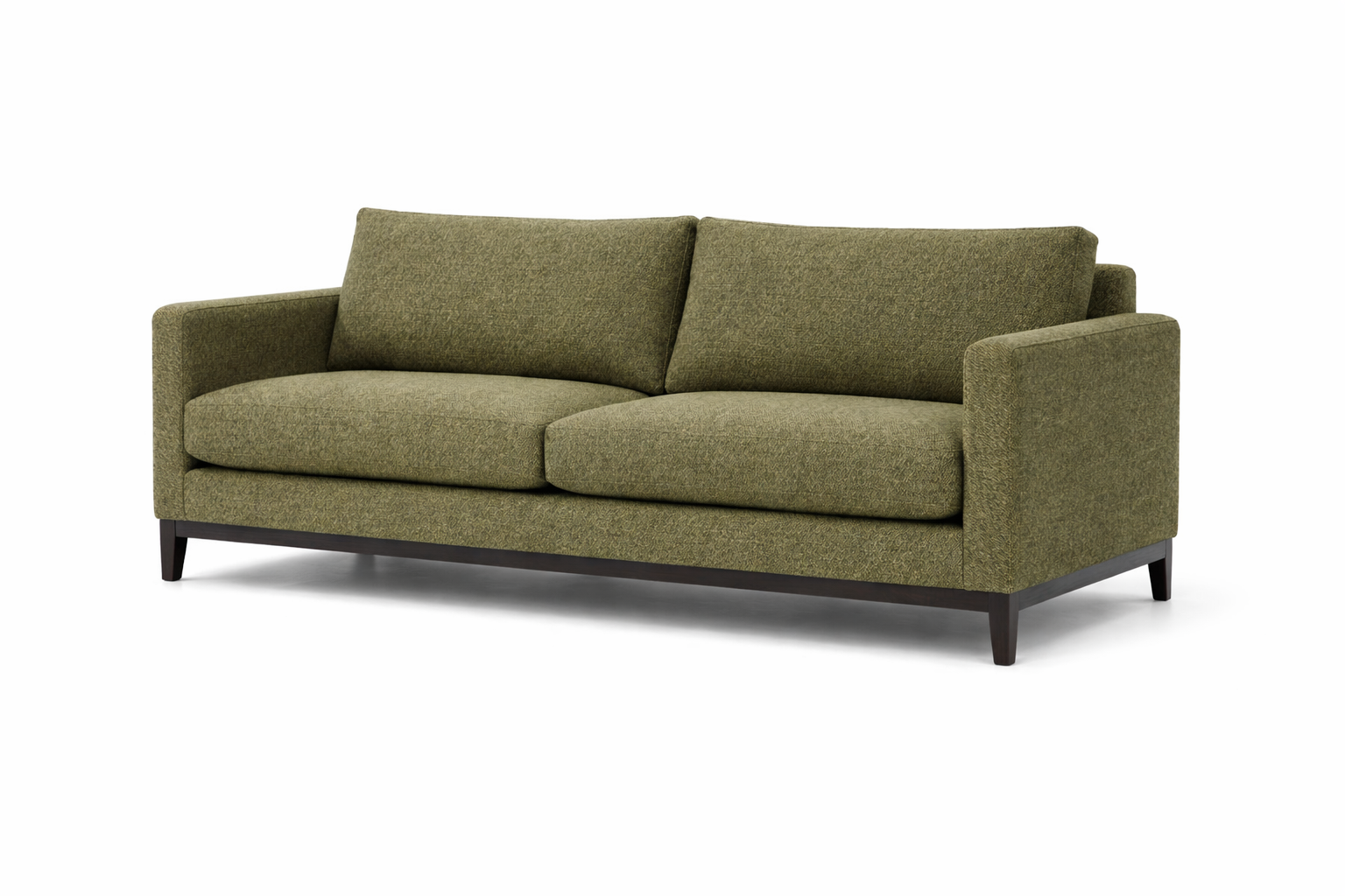 Its form balances comfort with clarity. The seat and back cushions are deliberately substantial, offering a relaxed sit without losing shape, while the tailored upholstery keeps the profile clean and composed. The arms sit at a confident height, framing the piece without excess bulk.