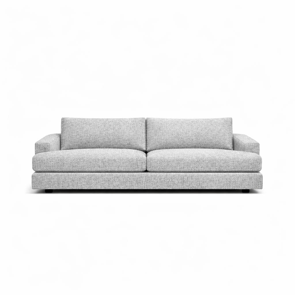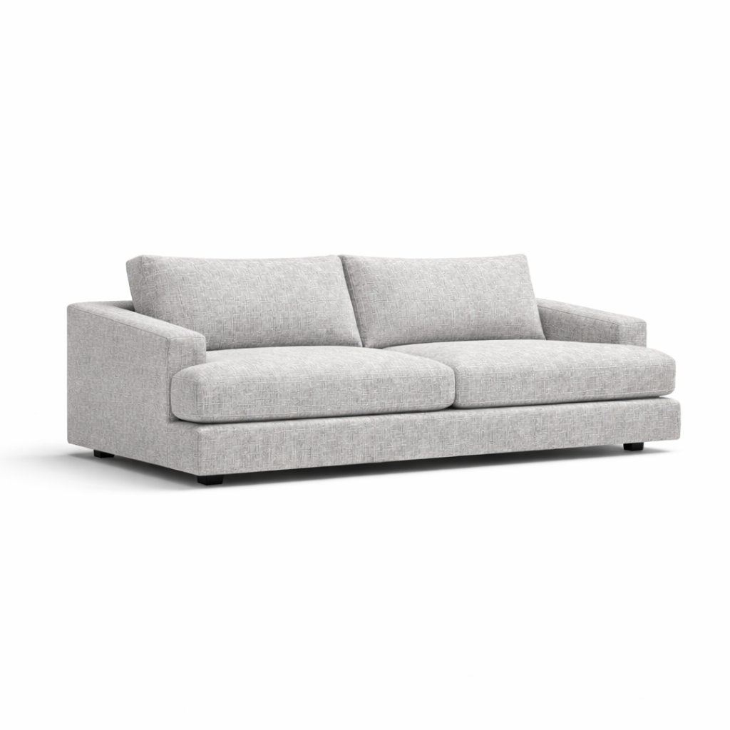 Clean, architectural lines are softened by deep seat cushions and wide armrests, creating a silhouette that feels grounded rather than oversized. The sofa sits low to the floor, reinforcing a sense of calm and stability, while the broad seat depth encourages relaxed, everyday use without appearing casual or slouched.