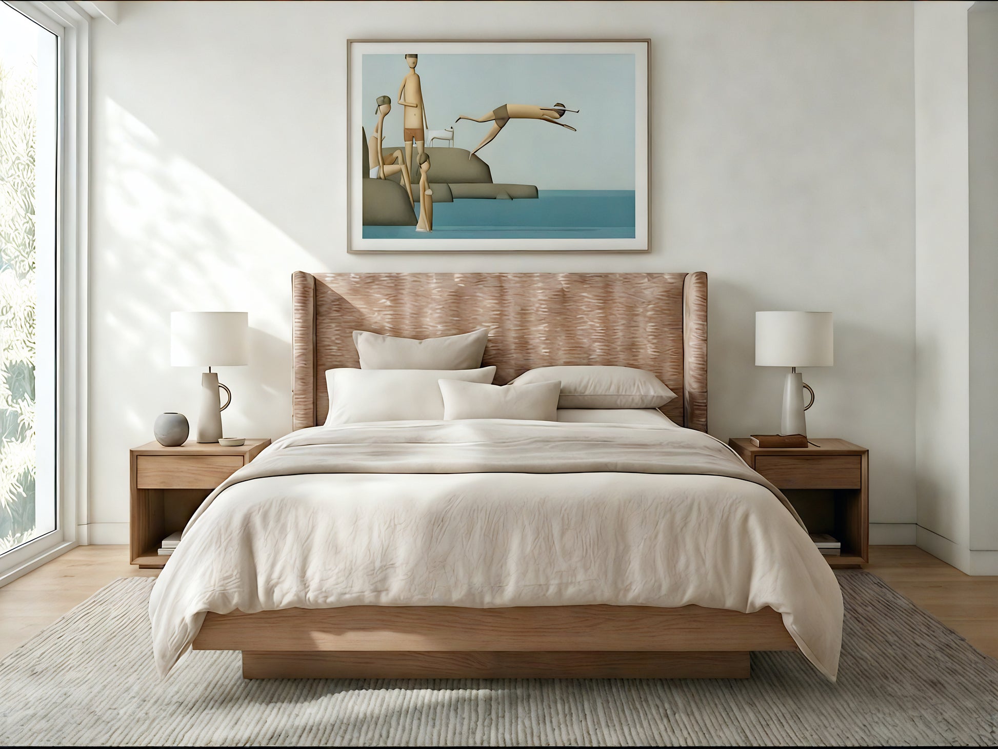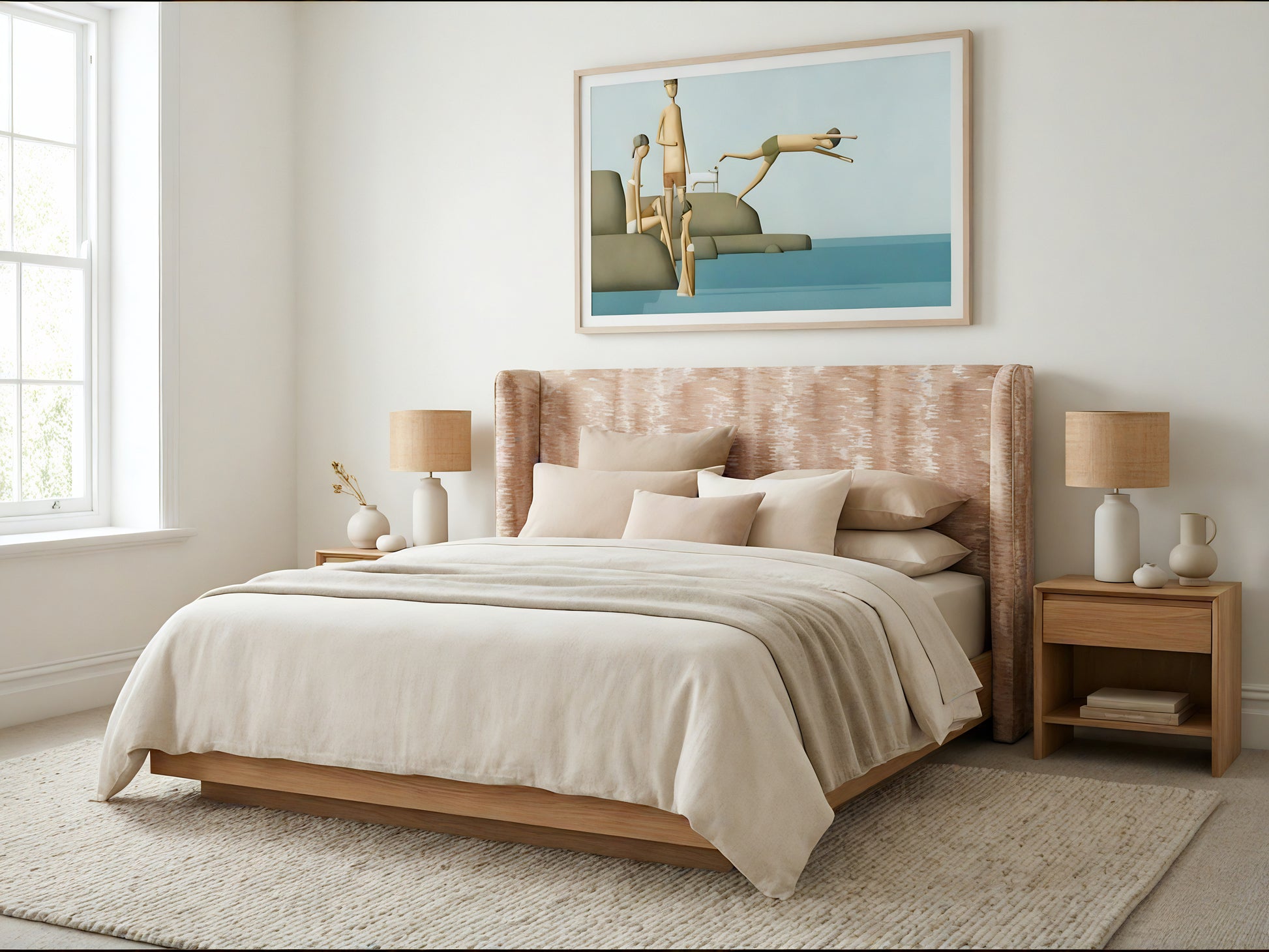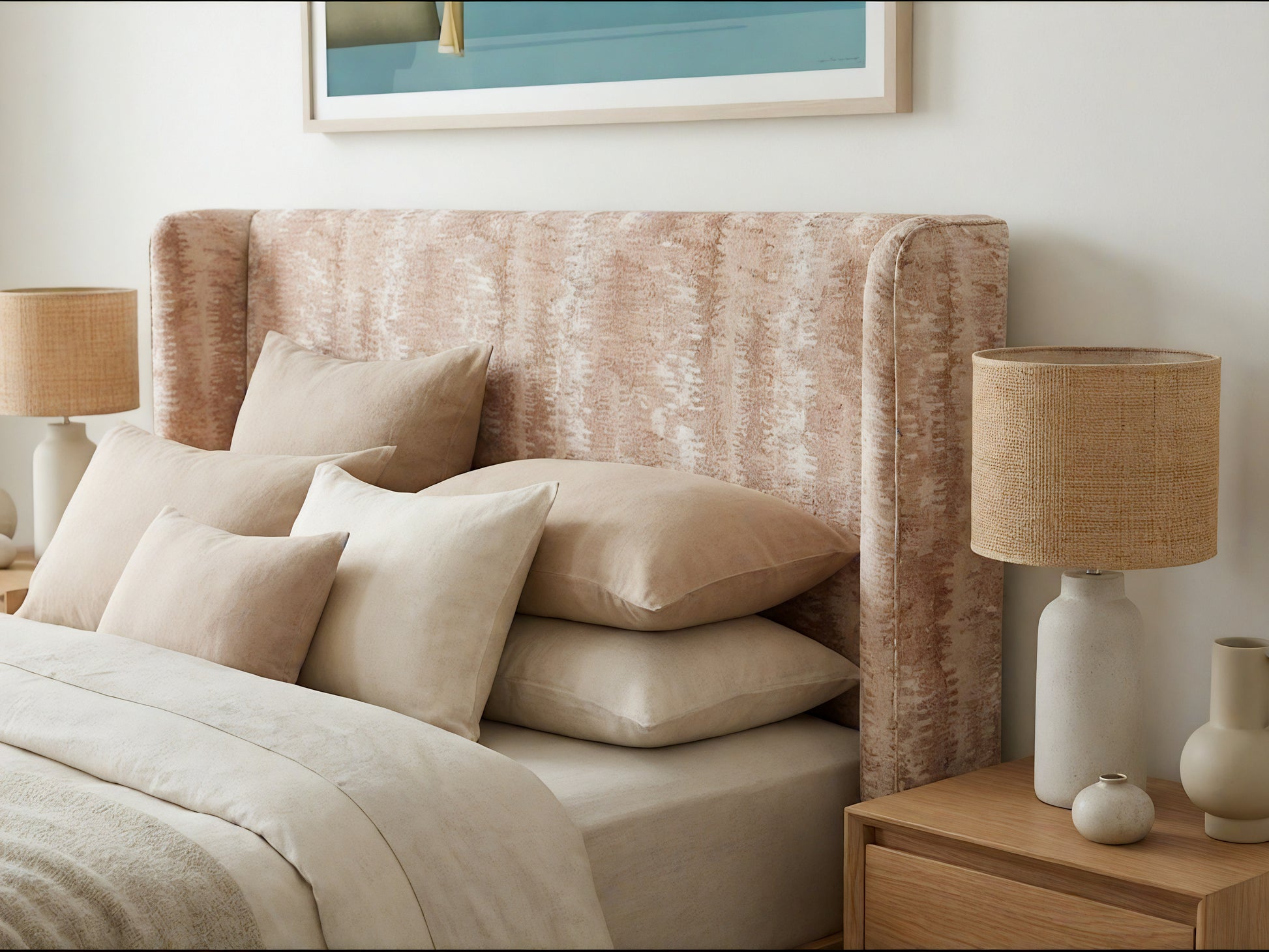 The Tate Bedhead is a refined statement piece with a gently curved profile and subtle winged sides that wrap the bed in a calm, tailored way. Its clean lines and generous scale create a strong focal point without feeling heavy, making it equally suited to relaxed coastal spaces and more structured, contemporary bedrooms. The upholstery is designed to read as soft and textured, giving the room warmth and depth while keeping the overall look restrained.