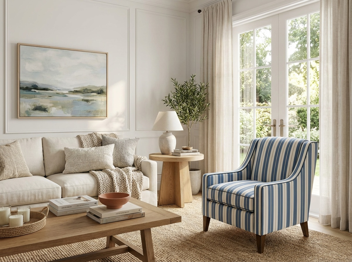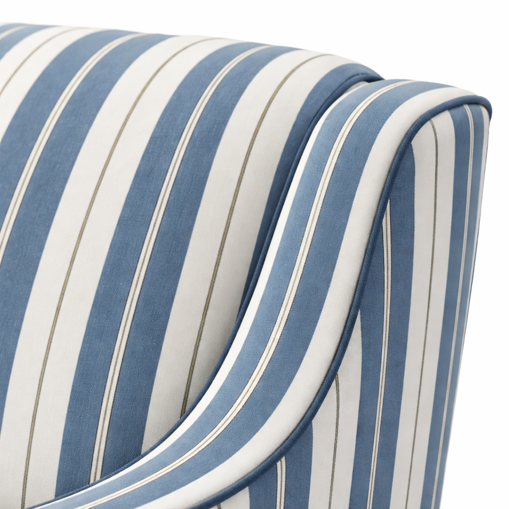 The example shown is upholstered in a premium blue and ivory striped fabric, finished with contrast piping and solid timber legs in a warm walnut tone. This particular fabric gives Valentina a relaxed coastal sensibility, yet its form is versatile enough to sit comfortably in both contemporary and transitional interiors.